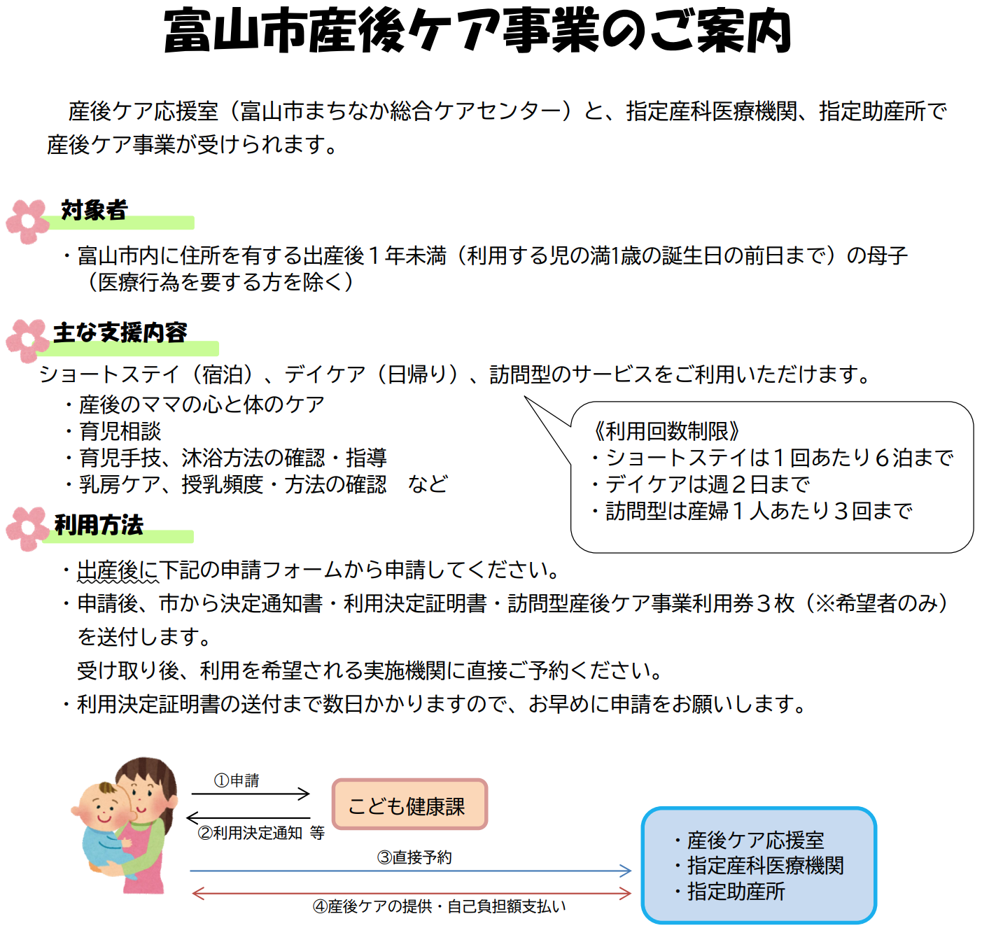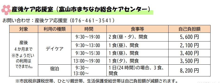 ※産後ケア応援室は富山市に里帰りしている方も利用できます。(里帰りの方は申請方法、自己負担額が異なります)